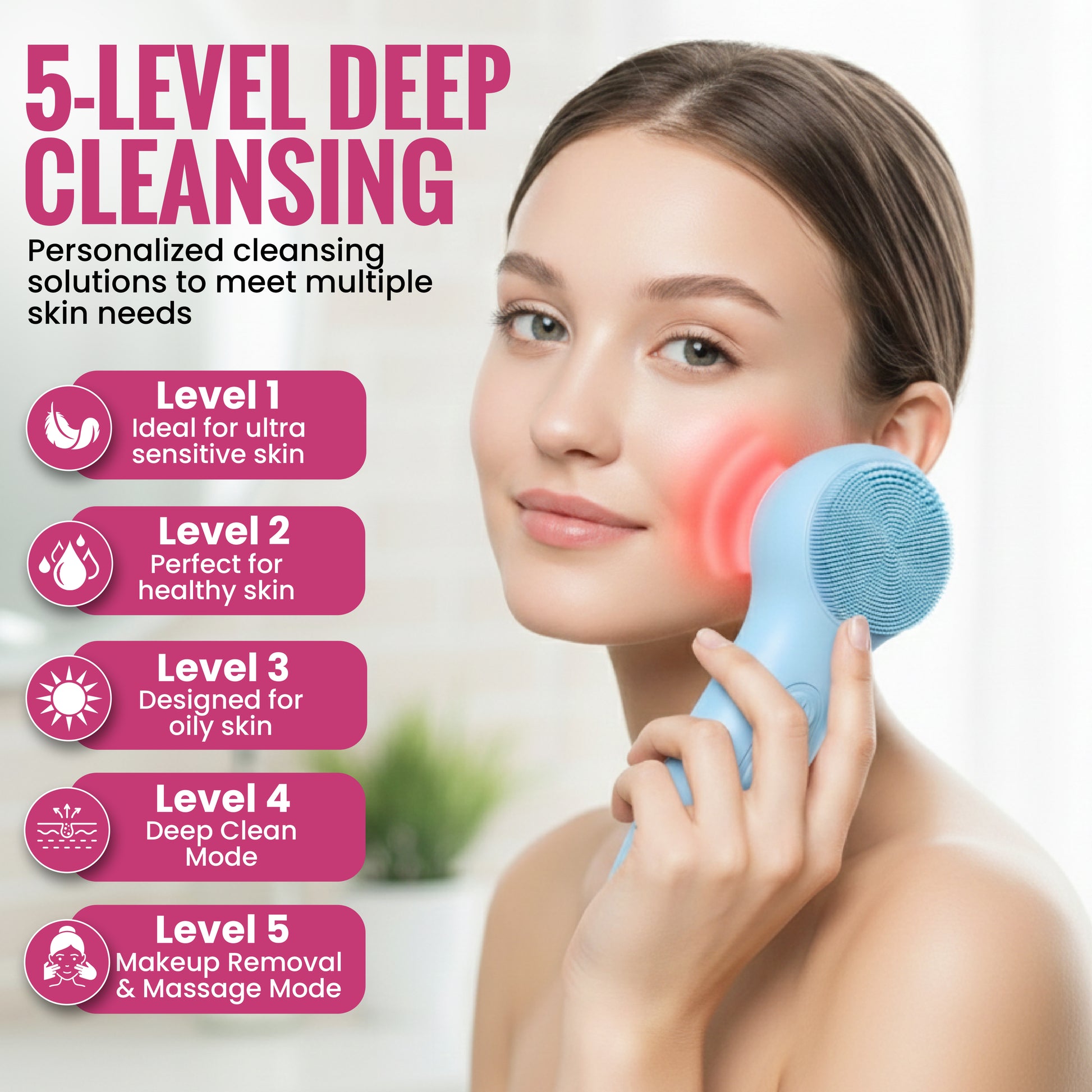 - Sonic Cleansing — removes makeup, oil and impurities 8× better than manual washing.